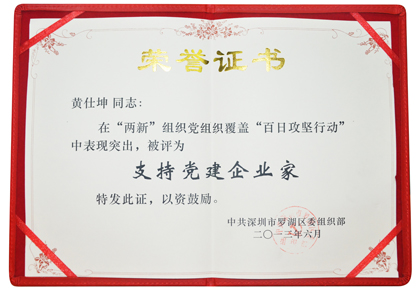 黄仕坤董事长获中共罗湖区委组织部授予“支持党建企业家”称号