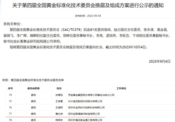 会上,国家标准化管理委员会标准技术管理司潘北辰宣读了第四届全国黄金标准化技术委员会组成人员名单,黄仕坤董事长受聘为第四届黄金标委会委员。
